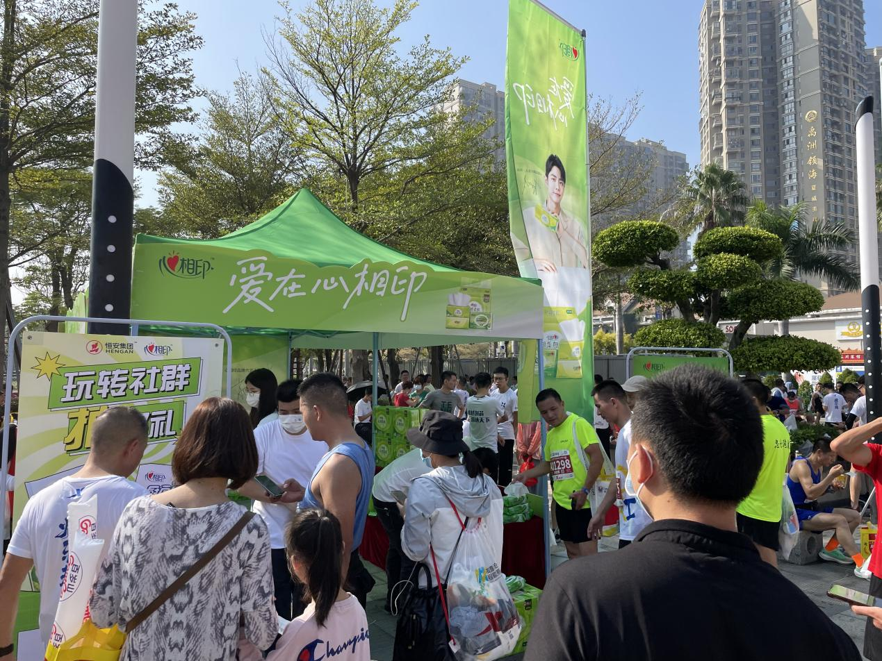 在终点休息处,快盈VIII“爱在心相印”的产品展示台一下子吸引了许多人的眼球。扫码加入社群就可获得礼品的活动让不少跑者、游客都纷纷前来。除此之外,加入社群后的抽奖游戏,也引起了大家的兴趣,驻足仔细聆听工作人员的介绍。